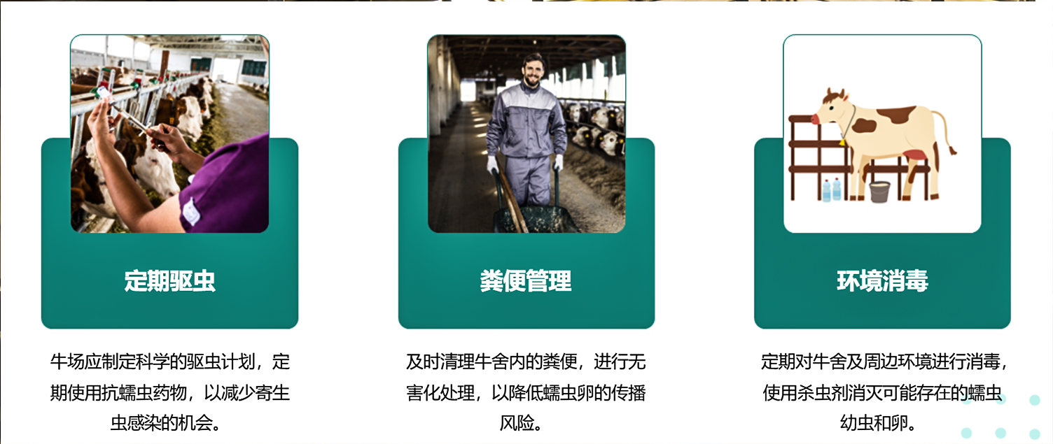 - 及时清理牛舍粪便,做发酵无害化处理,杀灭虫卵;定期消杀牛舍环境,阻断寄生虫传播。